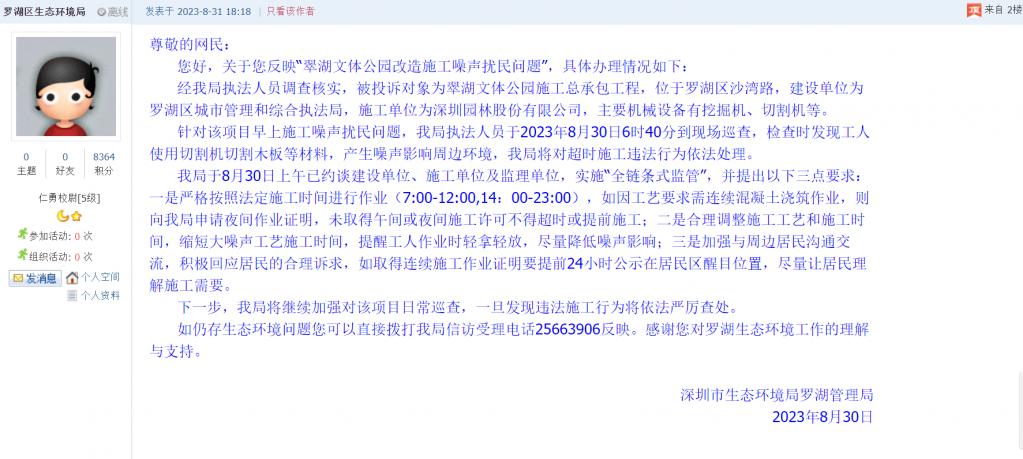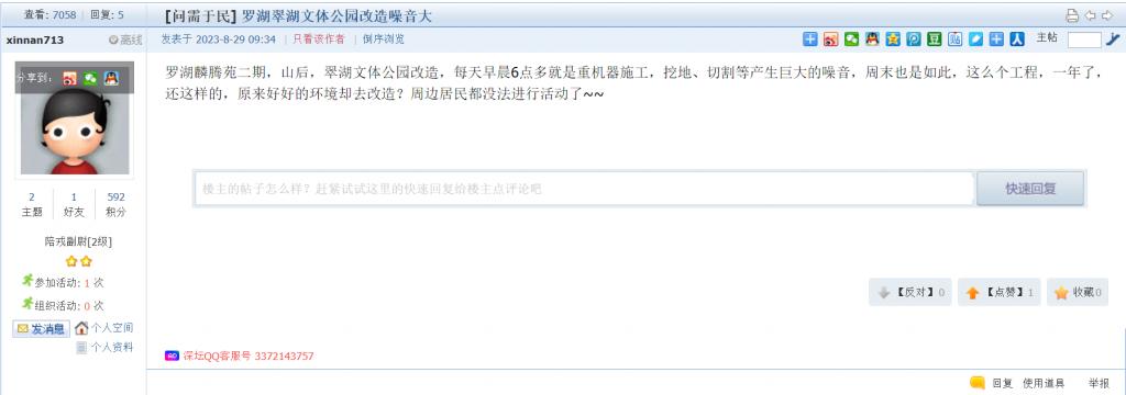 6、帖文《罗湖翠湖文体公园改造噪音大》