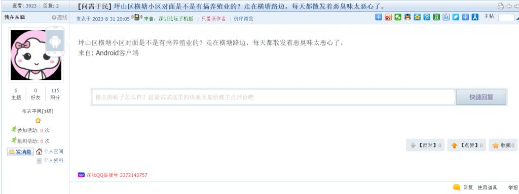 12、帖文《坪山区横塘小区对面是不是有搞养殖业的?走在横塘路边,每天都散发着恶臭味太恶心了。》