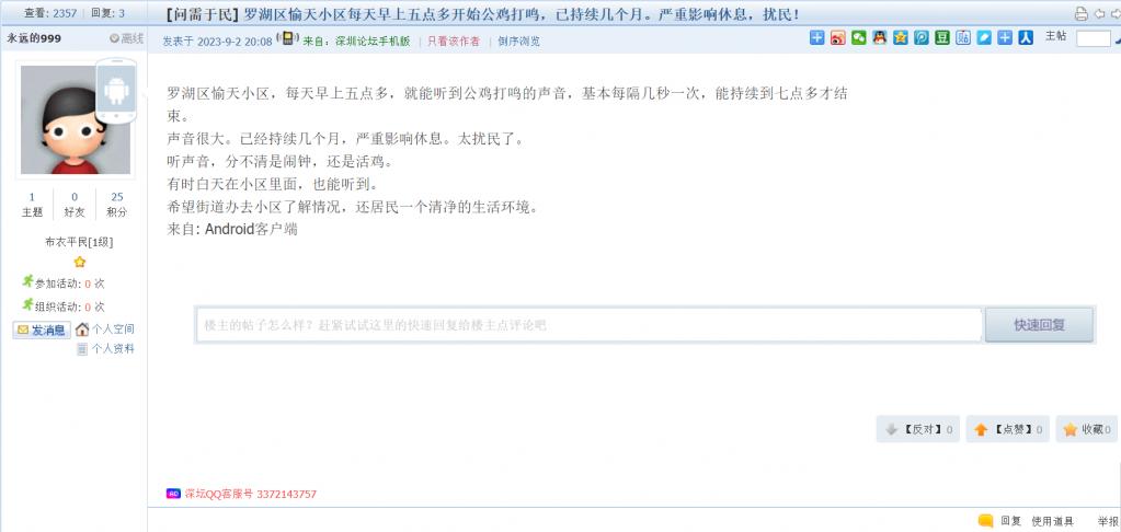 15、帖文《罗湖区愉天小区每天早上五点多开始公鸡打鸣,已持续几个月。严重影响休息,扰民!》