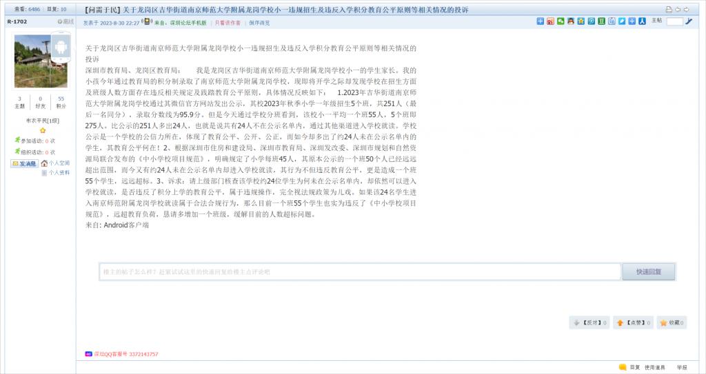 10、帖文《关于龙岗区吉华街道南京师范大学附属龙岗学校小一违规招生及违反入学积分教育公平原则等相关情况的投诉》