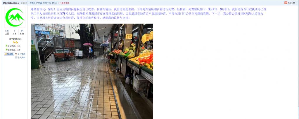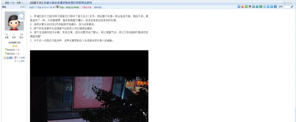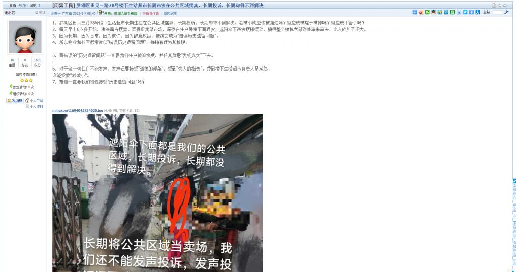 11、帖文《罗湖区田贝三路78号楼下生活超市长期违法在公共区域摆卖,长期投诉,长期却得不到解决》
