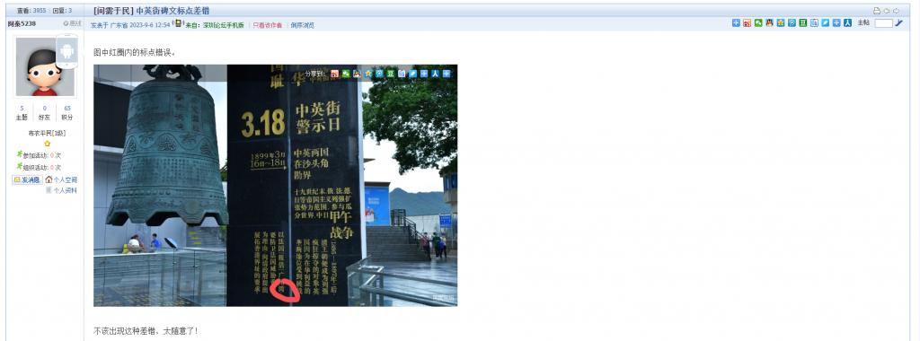 尊敬的网民朋友:您好!关于您在深圳论坛上反映的情况已收悉。经核实,碑文上下文内容为:“中日甲午战争(1895—1897年)后,清王朝便成为列强疯狂掠夺的对象,英国因为在华利益的垄断地位受到挑战,以法国[租借]广州湾,要防卫法国威胁香港为理由,向清政府提出展拓香港界址的要求。”您在图片上标示的符号为逗号,后续我们将认真做好维护保养工作,感谢您对我们工作的关心与支持!联系咨询电话0755-22746125。