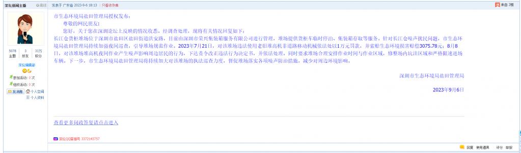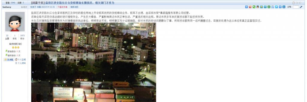 1、帖文《盐田区洪安路长江仓货柜堆场长期扰民,相关部门不作为》
