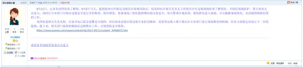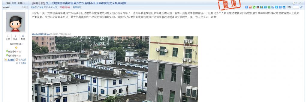 15、帖文《关于反映龙岗区南湾街道丹竹头新洲小区山体滑坡的安全风险问题》