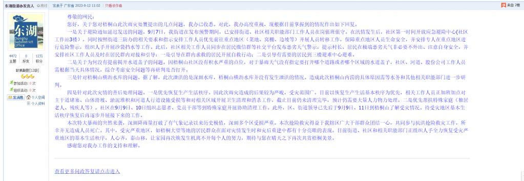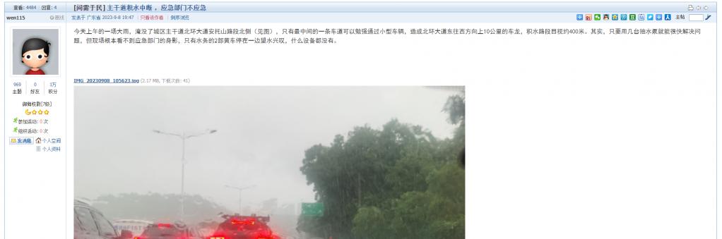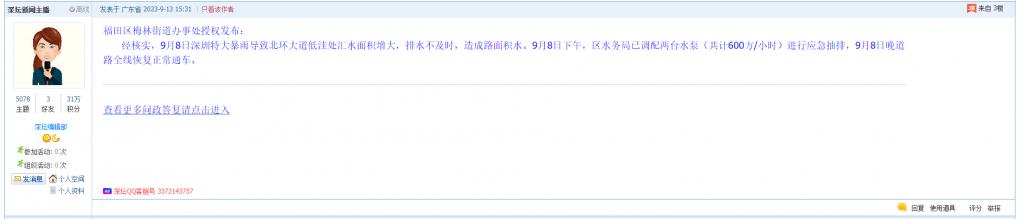 2023年9月8日19时47分,收到深圳论坛网民发布“主干道积水中断,应急部门不应急”的舆情后,深圳市福田区水务局高度重视,立即组织调查处理,现将处理情况回复如下: