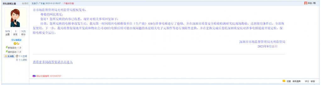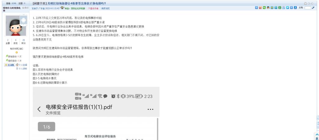 6、帖文《光明区绿地新都会4栋要等出事故才换电梯吗?》