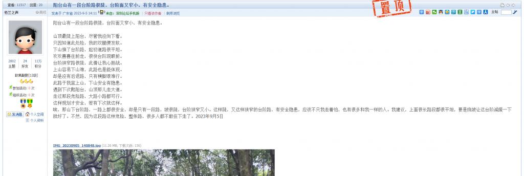 5、帖文《阳台山有一段台阶路很陡,台阶面又窄小,有安全隐患。》