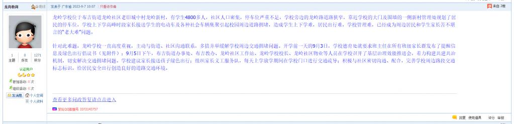 针对此难题,龙岭学校一直高度重视,主动与街道、社区沟通联系,多措并举缓解学校周边交通拥堵问题。开学前一天的9月3日,学校德育处就要求班主任在所有班级家长群发布了提醒信息及绿色出行倡议书(见附件);9月5日下午,布吉街道办事处、布吉教办、龙岭社区工作站、龙岭学校校长、龙岭社区物业等人员在学校召开了基层治理效能推进会,着力构建共建共治机制,切实解决交通拥堵问题。学校建议家长接送孩子绿色出行;组织家长义工服务队,每天上学放学期间在学校门口进行交通疏导;积极与社区密切沟通、配合,完善学校周边路段交通标志标识,给居民安全出行创造良好的道路交通环境。