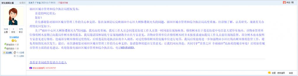 首先感谢您对福田区城市管理工作的关心和支持,您在深圳论坛反映福田中心区大树惨遭剃光头的问题,福田区城市管理和综合执法局高度重视,经详细了解,认真研究,现就有关办理情况回复如下: