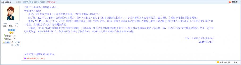 尊敬的网民朋友:您好,关于您在深圳论坛上反映的情况收悉。现将有关情况回复如下:经了解,2023年7月27日,启威测公司与园区二房东(出租方)签订了《租赁合同解除协议》,并于当日解除双方的租赁关系,10月5日,启威测公司陆续将物品搬离。据悉,9月15日,园区二房东已支付《租赁合同解除协议》约定的50%款项,但因启威测公司未在协议约定时间内搬离且截至目前已拖欠出租方3个月房屋租金(占有使用费)和4个月水电费,故出租方暂未支付协议剩余款项。启威测公司与出租方的纠纷属于民事租赁合同纠纷,项目现场工作组已多次搭建沟通协调的平台,如经双方协商或调解仍无法达成一致,建议通过诉讼途径解决此纠纷。另外,关于信访回复问题,9月4日我街道已依法依规通过短信进行了收悉告知,将按照法定途径处理并在规定时限内答复。