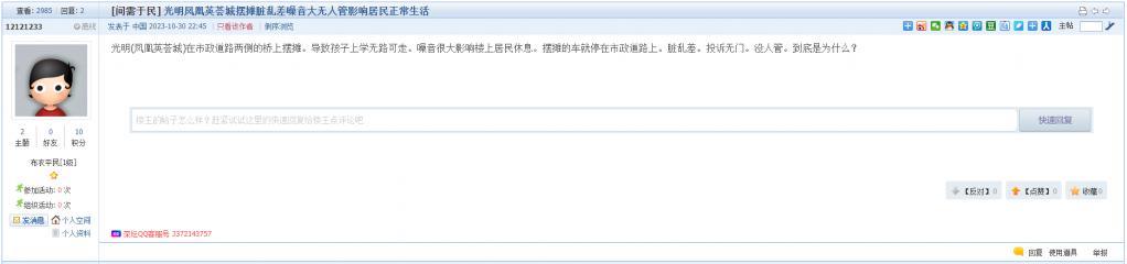 2、帖文《光明凤凰英荟城摆摊脏乱差噪音大无人管影响居民正常生活》
