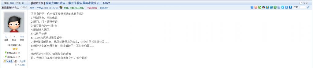 5、帖文《敢问光明区政府,搬迁补偿安置标准能公示一下吗?》