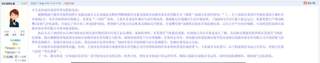 根据链接中投诉者提供的照片及我局执法人员实地走访勘察判断被投诉对象为深圳市深能环保东部有限公司(简称“深圳市东部环保电厂”),位于深圳市龙岗区坪地街道四方埔社区环保路1号,有营业执照和环保批文,有落实“三同时”验收,主要负责龙岗区城市生活垃圾处理,兼顾临近区域城市生活垃圾处理,于2019年12月3日投入稳定运行。每条焚烧生产线均配置1套烟气净化系统,并通过了项目竣工环境保护验收,焚烧烟气净化后经高集束式烟囱高空排放,并设置有烟气6条线及废水在线监测仪器,已在公开平台同步数据,可实时监控深圳市深能环保东部有限公司各项排放指标。