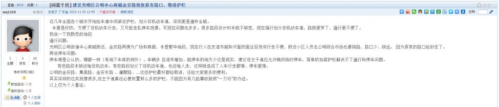 7、帖文《建议光明区公明中心商城金安路恢复原有路口,取消护栏》
