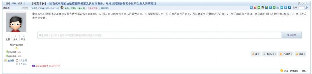 1、帖文《中国石化东湖加油站罩棚顶安装光伏发电设备,对周边鸿园居住宅小区产生重大消防隐患》