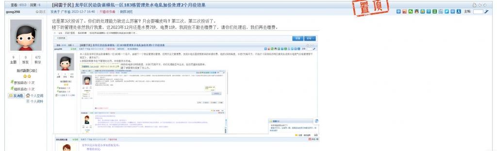 12、帖文《龙华区民治街道樟坑一区183栋管理处水电乱加价处理2个月没效果》