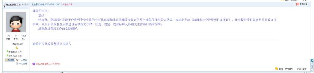 经核查,我局通过在线平台收到企业申报的中石化东湖加油站罩棚顶安装光伏发电设备项目相关信息后,按规定发放《深圳市社会投资项目备案证》。社会投资项目备案是非行政许可事项,项目所涉权利及后续建设应以相关法律法规、规定、规范标准及各相关主管部门要求为准。