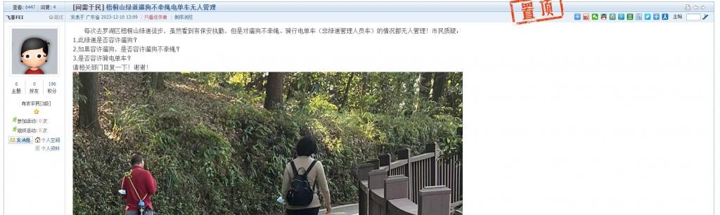 21、帖文《梧桐山绿道遛狗不牵绳电单车无人管理》