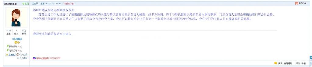莲花街道工作人员进行了前期摸排及现场蹲点均未能与梦氏健身天然店负责人碰面。经多方协调,终于与梦氏健身天然店负责人取得联系,门店负责人承诺会积极处理门店会员会籍、会费等相关问题且已在天然店门口张贴了闭店公告及转会方案,会员可以拨打公告上的任意一个联系电话或扫码登记转会信息,会有专门的工作人员对接处理相关问题。