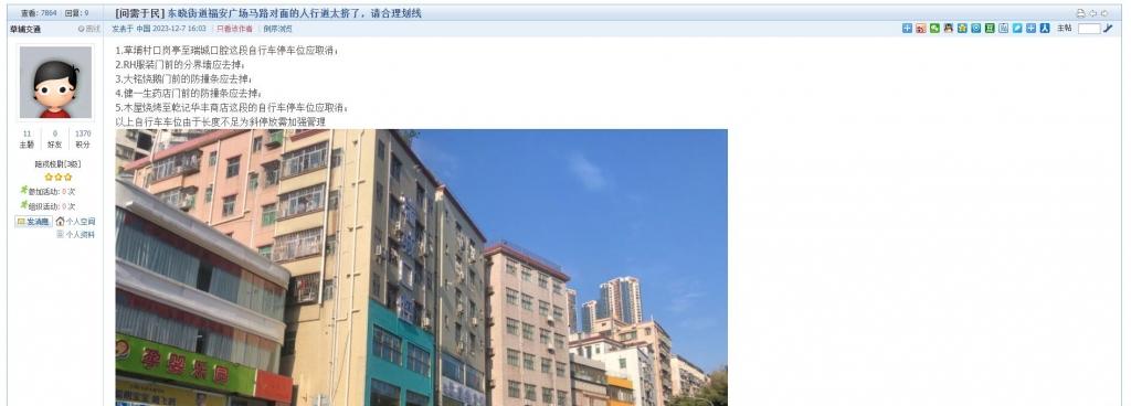 11、帖文《东晓街道福安广场马路对面的人行道太挤了,请合理划线》