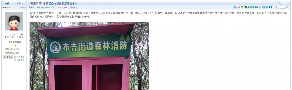 我局工作人员第一时间前往现场核实处理,情况如下:1.该园登山道消防设施破损问题属于森林消防负责维护,该单位已陆续对部分消防设施进行修缮,预计明年5月竣工;2.石芽岭公园登山道卫生问题已督促该园物业管理处对登山口和登山道进行全面清理,并加强日常管理工作。我局也将进一步督促街道加强日常监管工作。感谢市民朋友对城管工作的支持与理解!