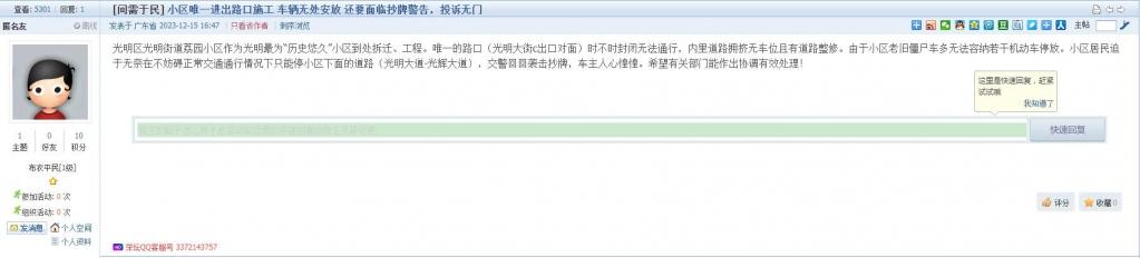 10、帖文《小区唯一进出路口施工 车辆无处安放 还要面临抄牌警告,投诉无门》