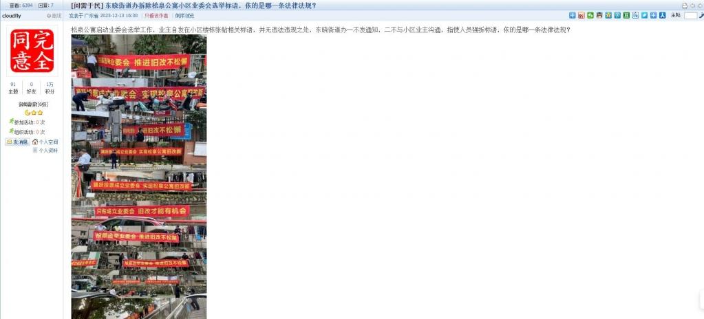 6、帖文《东晓街道办拆除松泉公寓小区业委会选举标语,依的是哪一条法律法规?》