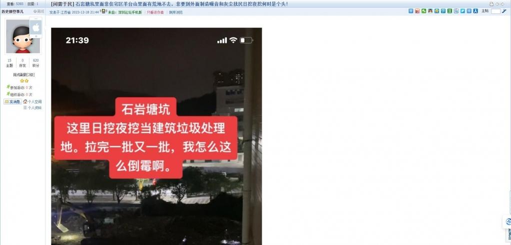2、帖文《石岩塘坑里面非住宅区羊台山里面有荒地不去,非要到外面制造噪音和灰尘扰民日挖夜挖何时是个头!》
