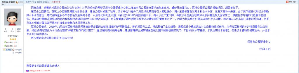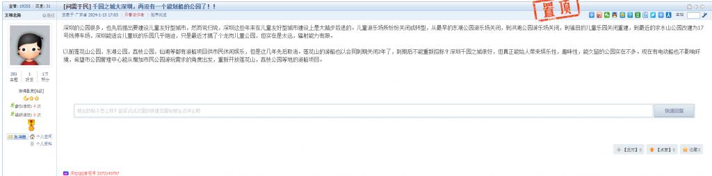 3、帖文《千园之城大深圳,再没有一个能划船的公园了!!》