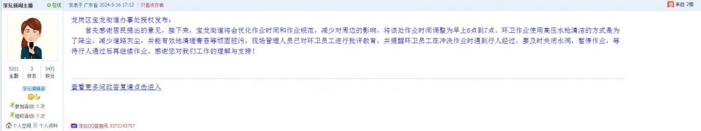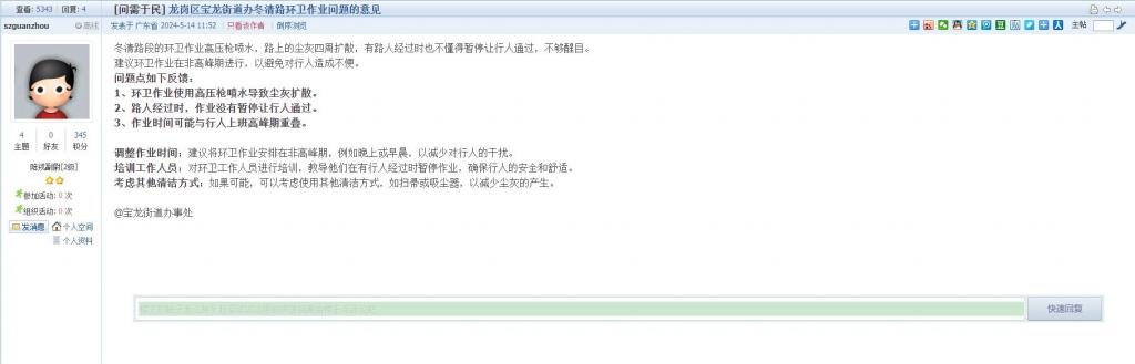 2、帖文《龙岗区宝龙街道办冬清路环卫作业问题的意见》
