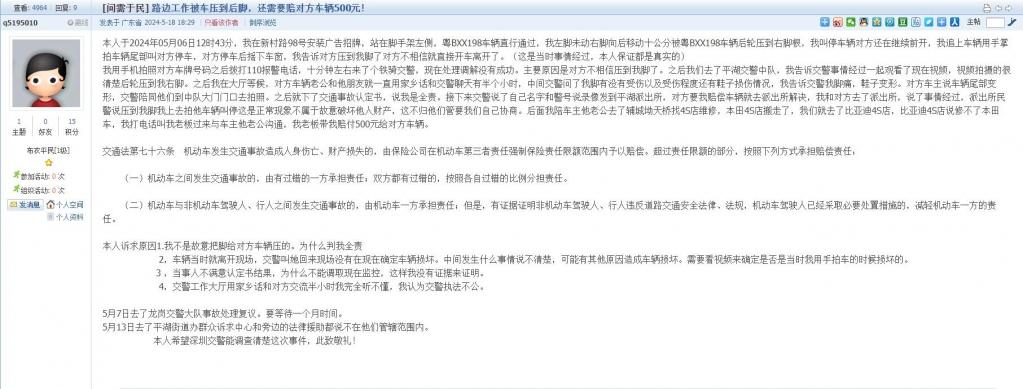 18、帖文《路边工作被车压到后脚,还需要赔对方车辆500元!》