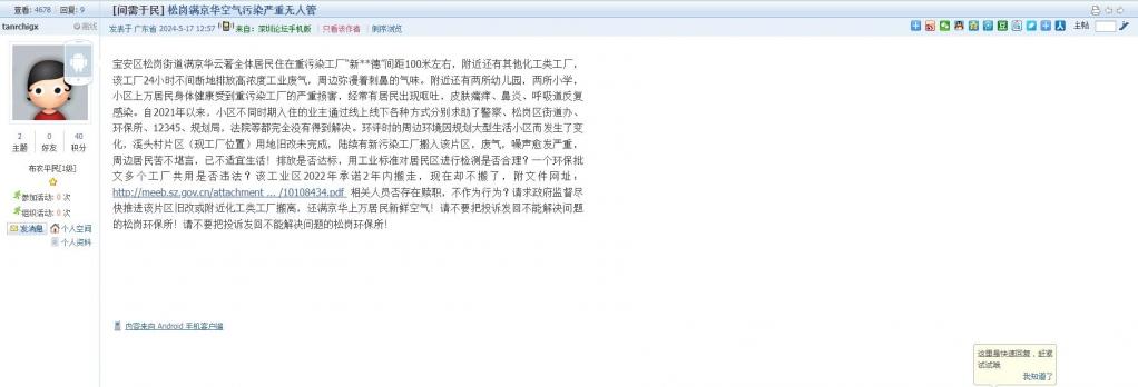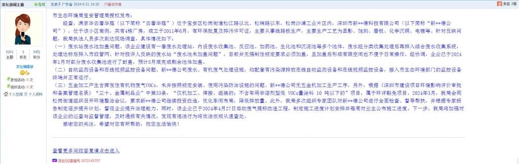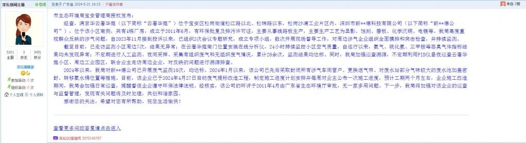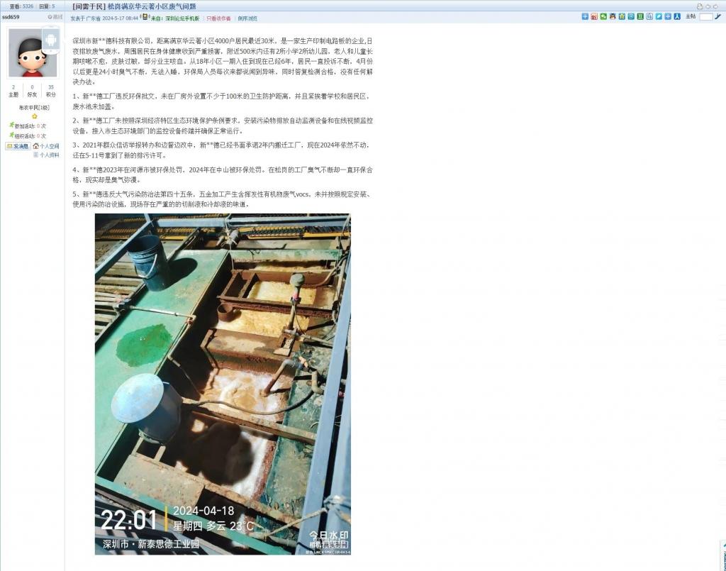 经查,满京华云著华庭(以下简称“云著华庭”)位于宝安区松岗街道松江路以北、松瑞路以东,松岗沙浦工业片区内,深圳市新**德科技有限公司(以下简称“新**德公司”),位于该小区南侧,共有4栋厂房,成立于2011年6月,有环保批复及排污许可证,主要从事线路板生产,主要生产工艺为显影、蚀刻、磨板、化学沉铜、电镀等。我局高度重视群众反映的涉气问题,自2023年11月接到投诉以来,已组织2次会议专题研究,成立专项小组,数次开展现场督导工作,对周边涉气企业组织全面摸排和突击检查,并持续监测。