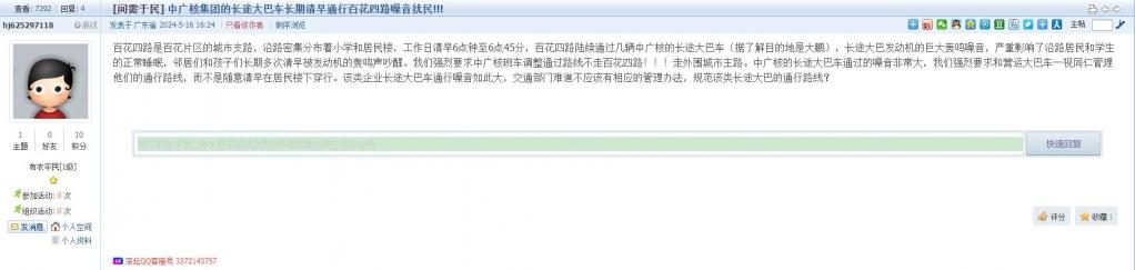 20、帖文《中广核集团的长途大巴车长期清早通行百花四路噪音扰民!!!》