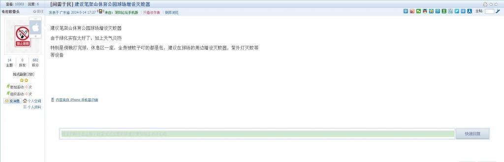 3、帖文《建议笔架山体育公园球场增设灭蚊器》