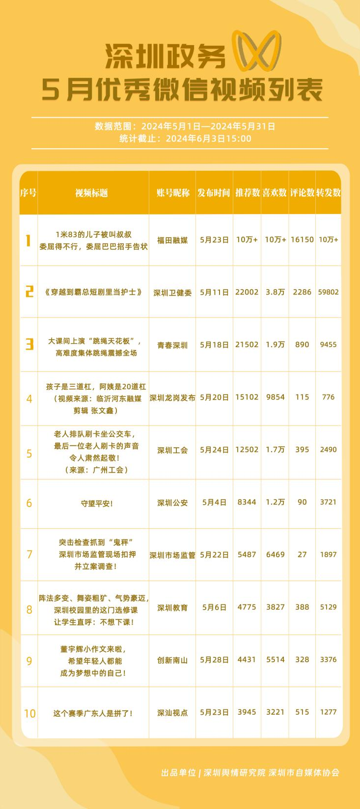 5月,政务微信视频号“福田融媒”“深圳卫健委”“深圳教育”“青春深圳”“深圳天气”“创新南山”“深汕观点”“深圳龙岗发布”“深圳工会”和“深圳市场监管”入选“深圳优秀政务微信视频号”,以上上榜单位都能够在持续发挥政务单位主体功能的同时,稳定输出观众所需的优质内容。结合整体数据来看,5月深圳政务视频号平台内容百花齐放,出现多个优质、热门作品,如《1米83的儿子被叫叔叔委屈得不行,委屈巴巴招手告状》《穿越到霸总短剧里当护士》等,是各上榜单位积极探索政务新媒体正能量传播机制的良好体现。