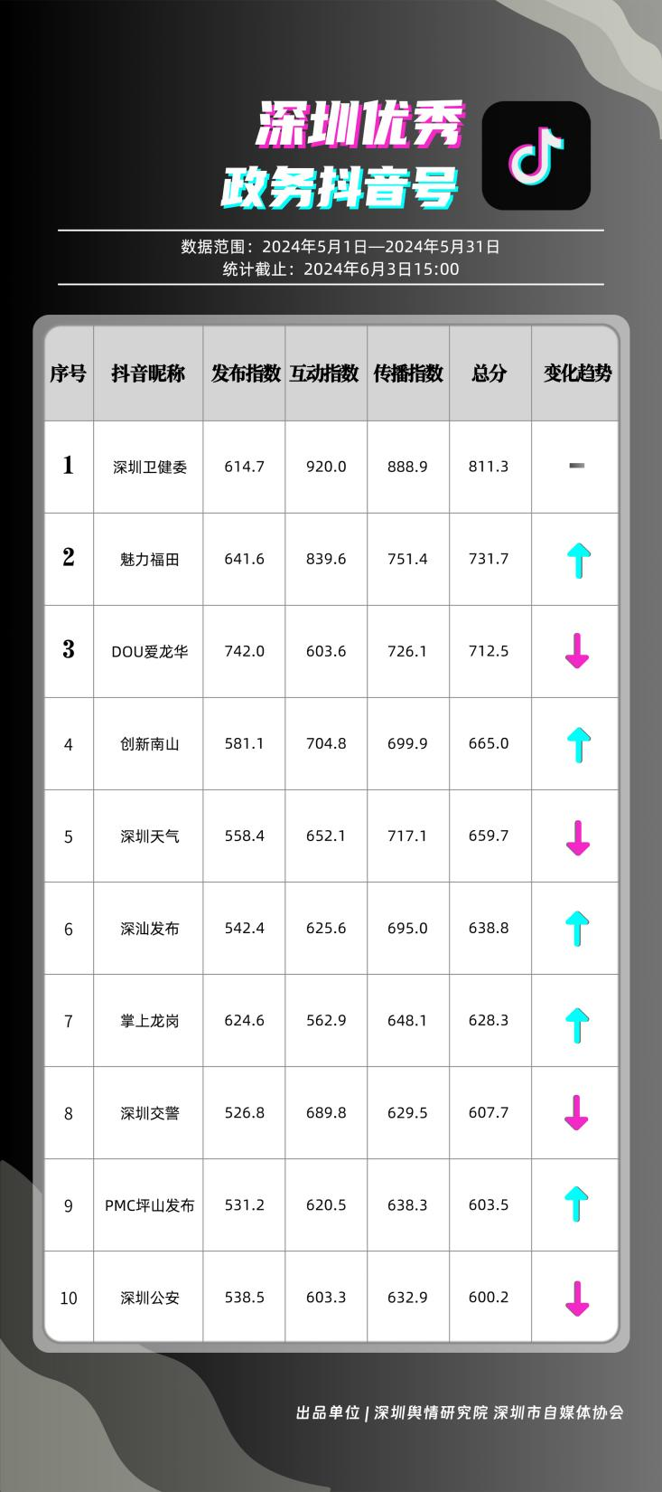 5月,共有10个政务抖音号获得“深圳优秀政务抖音号”称号,分别是“深圳卫健委”“魅力福田”“DOU爱龙华”“创新南山”“深圳天气”“深汕发布”“掌上龙岗”“深圳交警”“PMC坪山发布”和“深圳公安”,多个政务抖音号能够把握短视频平台宣传要领,持续发布优质信息内容,做到了政务便民化、政务信息传播高效化,为政务信息发布模式开创新渠道树立了良好典范。
