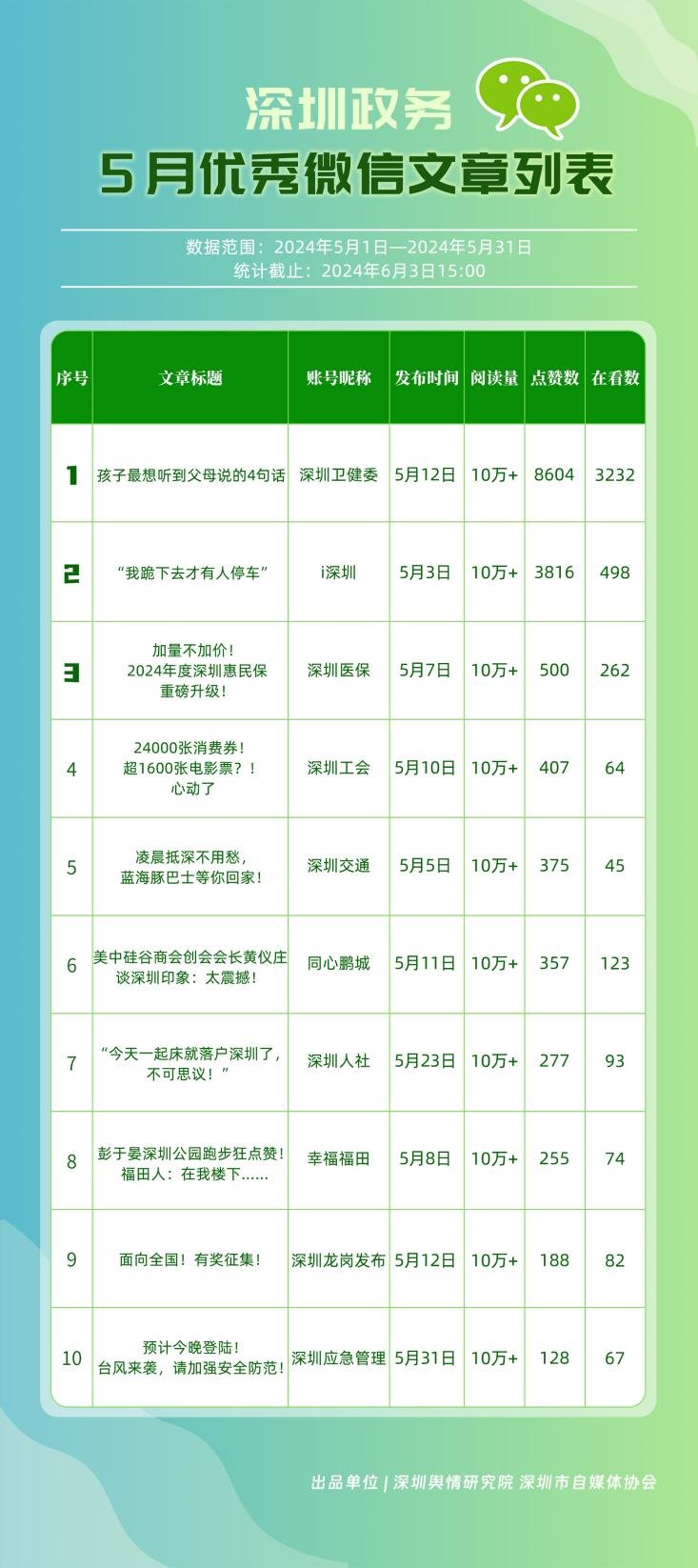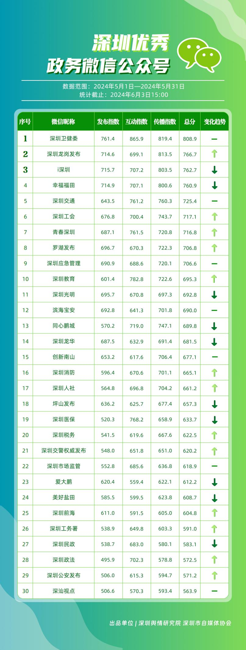 5月,“深圳卫健委”“深圳龙岗发布”“i深圳”“幸福福田”“深圳交通”“深圳工会”“青春深圳”“罗湖发布”“深圳应急管理”“深圳教育”等30个政务微信公众号,被评为“深圳优秀政务微信公众号”。5月,“深圳卫健委”凭借精心创作的内容、与受众深入互动,多篇作品深受好评,荣登榜单首位。“深圳龙岗发布”“i深圳”“幸福福田”“深圳交通”等上榜公众号也积极捕捉观众优质作品需求,把握主流热点趋势,集中发挥政务媒体传播力量,在本期也取得了较为亮眼的成绩,进一步推动了政务信息传播工作提质增效。