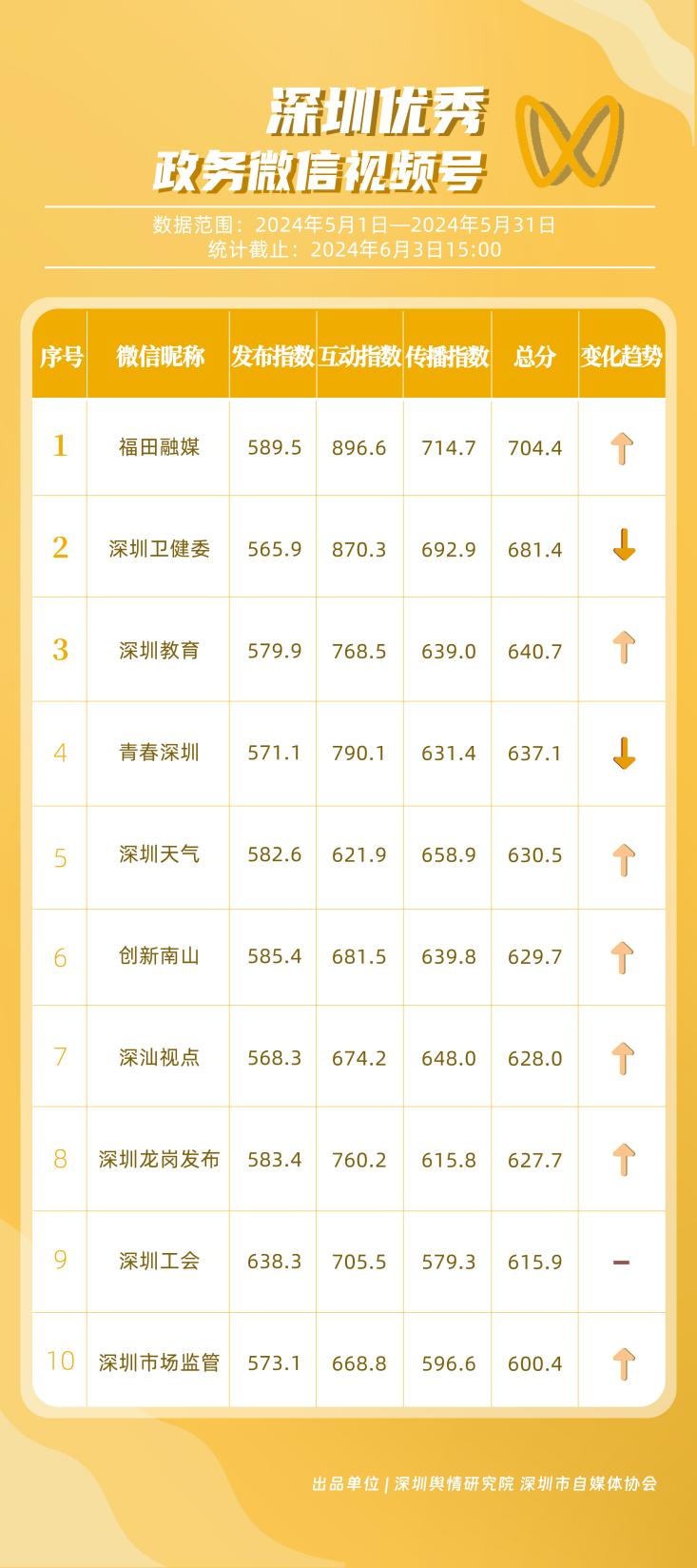 榜单在持续展示深圳政务新媒体矩阵建设成效的同时,梳理总结了深圳政务微信公众号、微信视频号、微博号、抖音号、头条号的运营方法与经验,是政务公开、回应群众关切的重要载体。5月,哪些政务新媒体在本期深受好评,荣登榜单?《深圳优秀政务新媒体矩阵》(2024年5月期)邀您共同关注。