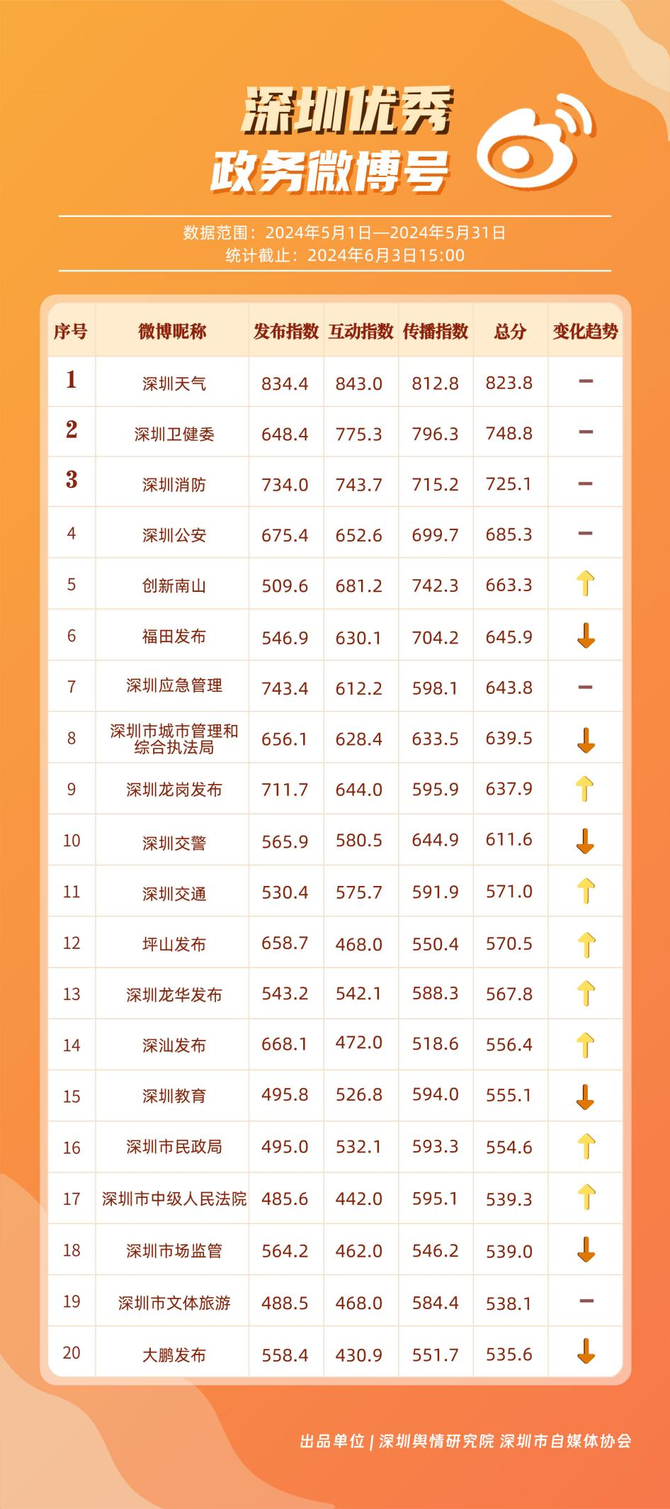 5月,“深圳天气”“深圳卫健委”“深圳消防”“深圳公安”“创新南山”“福田发布”“深圳应急管理”“深圳市城市管理和综合执法局”“深圳龙岗发布”“深圳交警”等20个政务微博号入列“优秀”名单。对比上期来看,“深圳天气”“深圳卫健委”“深圳消防”“深圳公安”发挥稳定,能够合理利用微博传播渠道,持续输出受众喜闻乐见的高质量内容,“创新南山”“深圳龙岗发布”等微博号则在5月发力宣传,整体传播效果有所提升,收获网民好评。