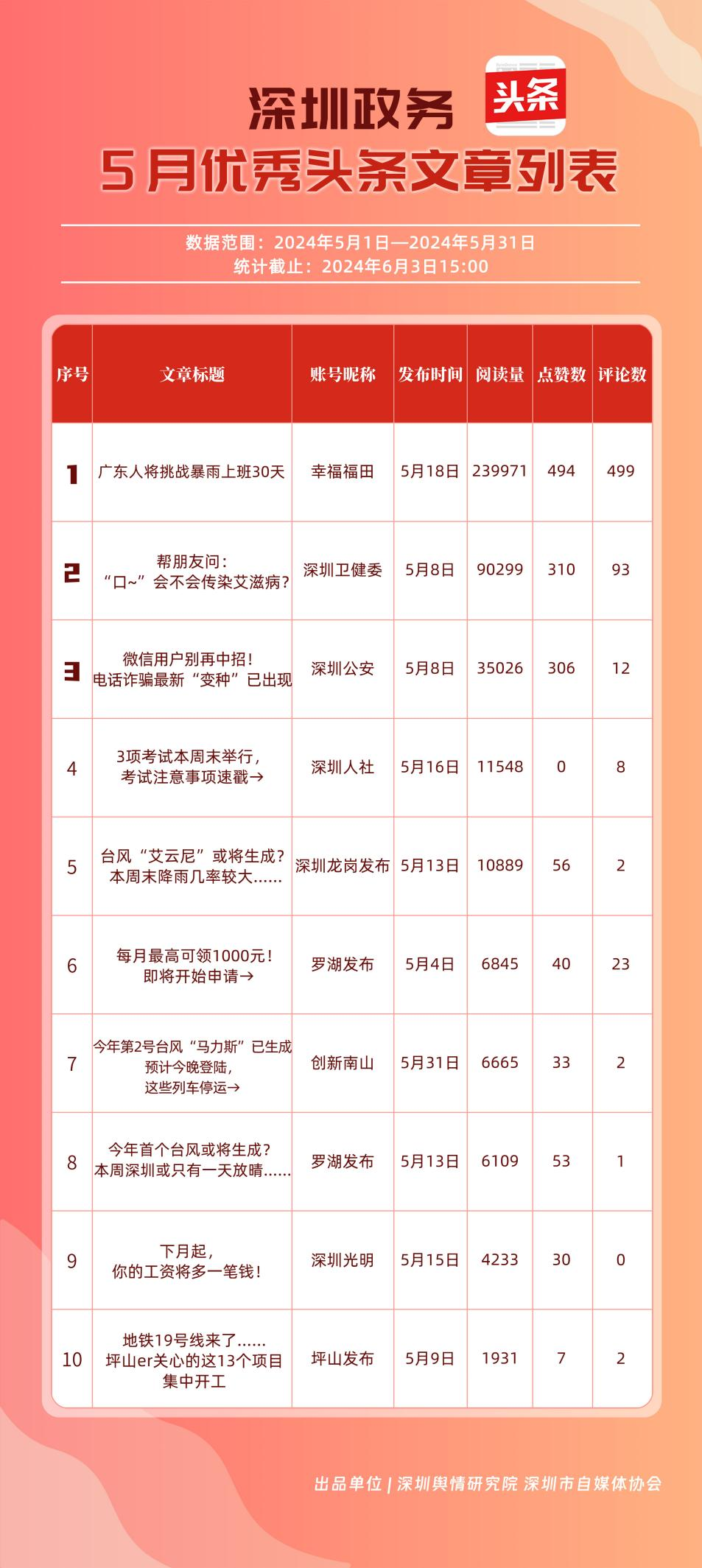 5月,“幸福福田”“深圳龙岗发布”“深圳卫健委”“深圳龙华”“深圳公安”“创新南山”“深圳光明”“罗湖发布”“深圳人社”“坪山发布”共10个政务头条号能够及时发布政务信息及公共服务信息,服务经济社会发展,满足公众信息需求,位列“优秀政务头条号”榜单,《广东人将挑战暴雨上班30天》《帮朋友问:“口~”会不会传染艾滋病?》等优秀文章资讯深入人心。其他未上榜单位应积极运用该新媒体平台助力政务公开,让权威声音有效传播到目标受众,更好地服务人民群众。