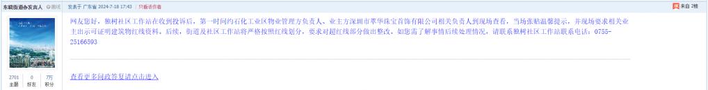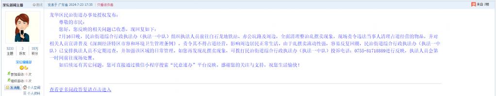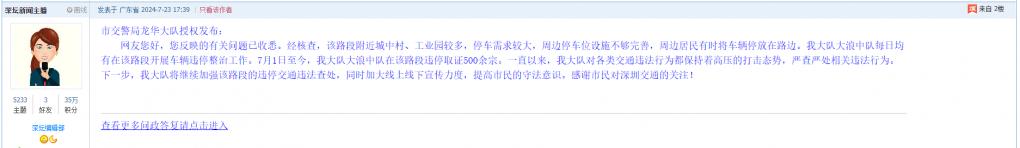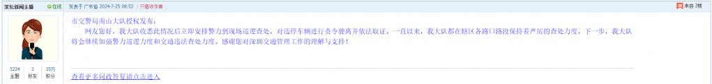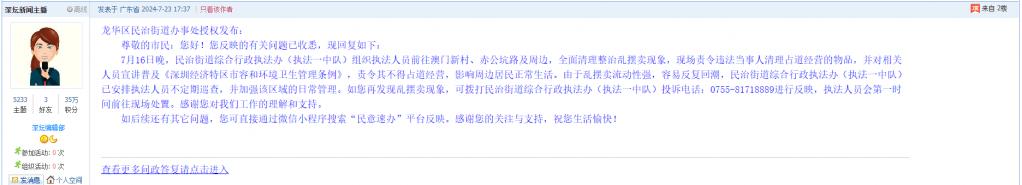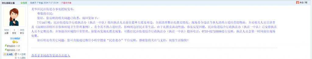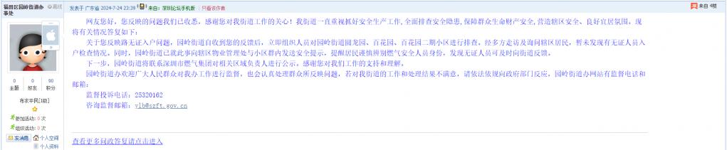 各职能单位如需对网友反映的问题进行回应,可在深圳论坛注册官方账号并通过认证,回帖进行回应。