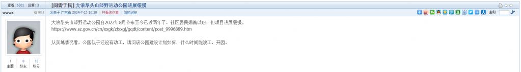 12. 帖文《大浪犁头山郊野运动公园进展缓慢》