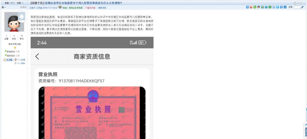 18. 帖文《深圳市龙华区市场监管对于列入经营异常商家为什么不处理呢?》