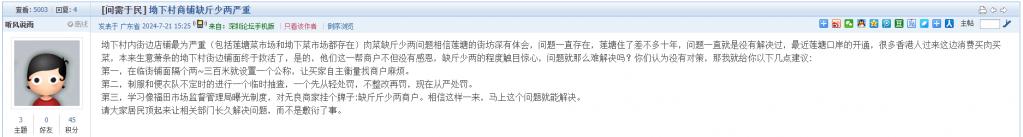 网友如有相关诉求、建言和意见的,可直接在深圳论坛“我说深圳事”栏目发帖进行报料、投诉,或者通过官方报料QQ以及问政热线等渠道反映诉求。