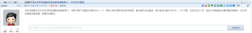 14. 帖文《龙华花园新村电信基站拆除两个,片区信号极差》
