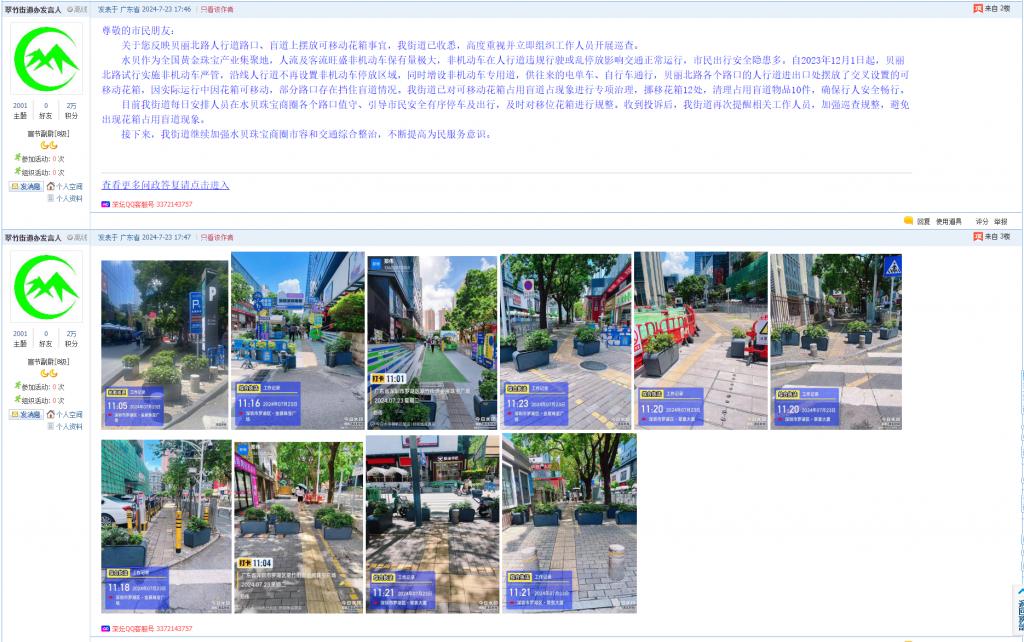 关于您反映贝丽北路人行道路口、盲道上摆放可移动花箱事宜,我街道已收悉,高度重视并立即组织工作人员开展巡查。水贝作为全国黄金珠宝产业集聚地,人流及客流旺盛非机动车保有量极大,非机动车在人行道违规行驶或乱停放影响交通正常运行,市民出行安全隐患多。自2023年12月1日起,贝丽北路试行实施非机动车严管,沿线人行道不再设置非机动车停放区域,同时增设非机动车专用道,供往来的电单车、自行车通行,贝丽北路各个路口的人行道进出口处摆放了交叉设置的可移动花箱,因实际运行中因花箱可移动,部分路口存在挡住盲道情况。我街道已对可移动花箱占用盲道占现象进行专项治理,挪移花箱12处,清理占用盲道物品10件,确保行人安全畅行。目前我街道每日安排人员在水贝珠宝商圈各个路口值守、引导市民安全有序停车及出行,及时对移位花箱进行规整。收到投诉后,我街道再次提醒相关工作人员,加强巡查规整,避免出现花箱占用盲道现象。接下来,我街道继续加强水贝珠宝商圈市容和交通综合整治,不断提高为民服务意识。