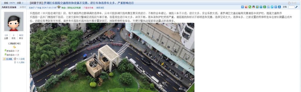 9. 帖文《罗湖区乐园路交通组织和设施不完善,逆行车和违停车太多,严重影响出行》