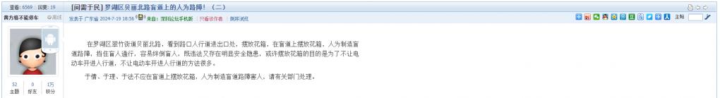 16. 帖文《罗湖区贝丽北路盲道上的人为路障!(二)》