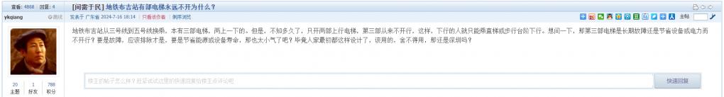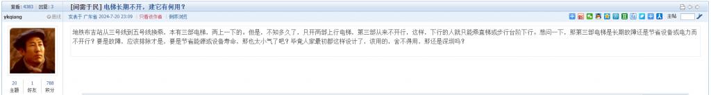 20. 帖文《地铁布吉站有部电梯永远不开为什么?》、《电梯长期不开,建它有何用?》