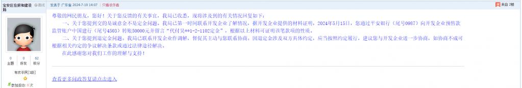 一、关于您提到交的是诚意金不是定金问题。我局已第一时间联系开发企业了解情况,据开发企业提供的材料证明,2024年5月15日,您通过平安银行(尾号0987)向开发企业预售款监管账户中国建行(尾号4503)转账50000元并留言“代付吴**1-2-1102定金”,根据以上材料可证明该笔款项的性质。